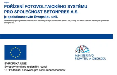 Předmětem projektu je instalace fotovoltaické elektrárny (FVE) o instalovaném výkonu 199,68 kWp pro vlastní spotřebu elektřiny ve společnosti Betonpres a.s.