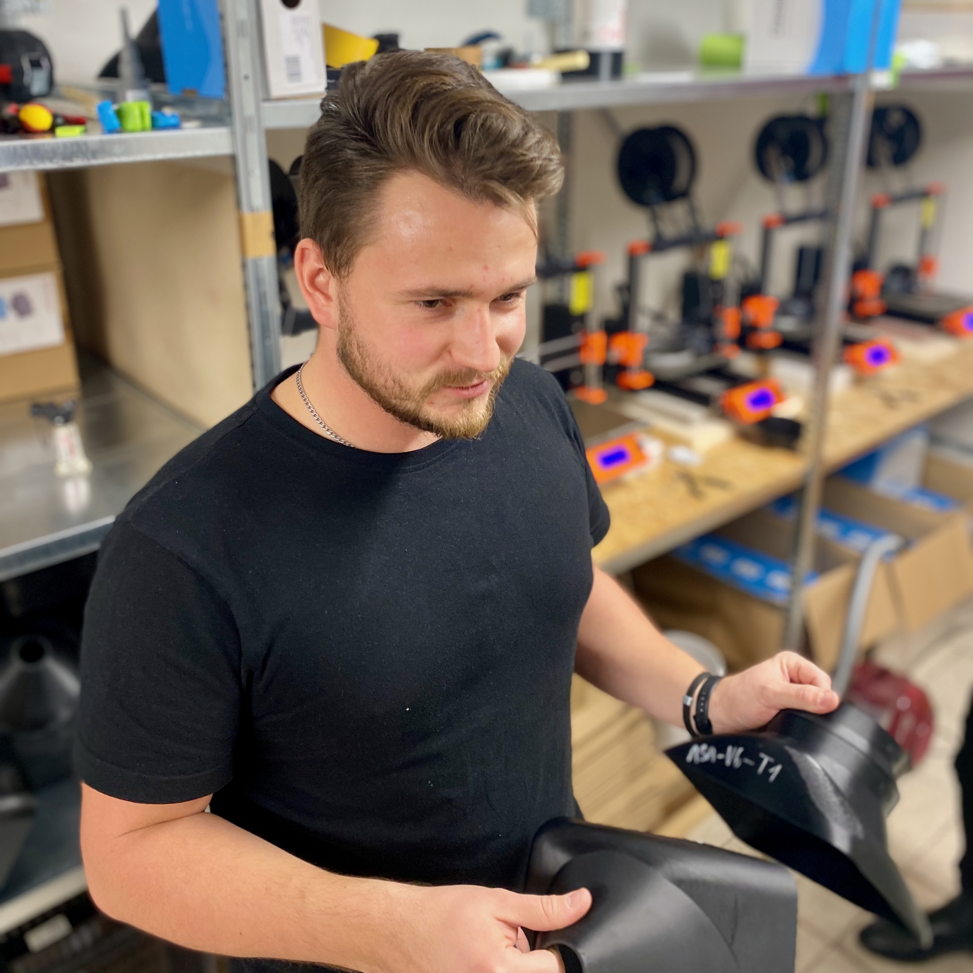 Materiál, ze kterého výrobky na 3D tiskárně vznikají, je tepelně odolnější PETG. A jaká je kapacita jedné 3D tiskárny? Kvůli zajištění kvality produktu zvládne maximálně 2 komponenty za 24 hodin. Celá 3D farma je pak v provozu 24/7. Obsluhu a správu výroby 3D tiskem zajišťuje jeden ze společníků firmy se svým specializovaným týmem. „Máme hodně náročné tvary pro tisk, ale námi požadovaná kvalifikace je především chuť do práce a smysl pro detail,“ usmívá se Jakub Ponec.