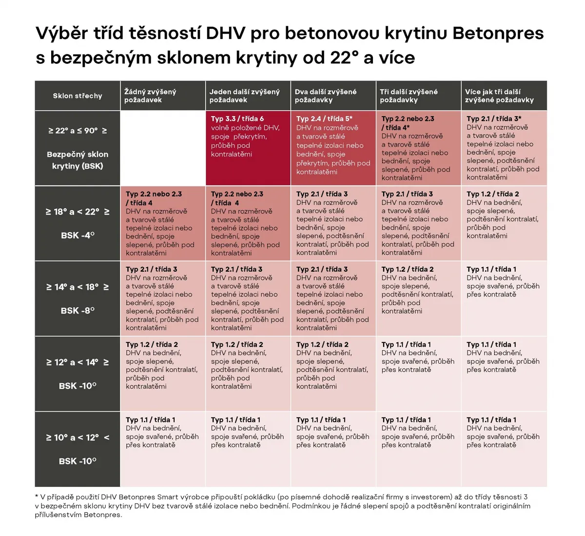 - V případě, že střecha má výrazné riziko vzniku hydrostatického tlaku vody, je nutné od rizikového místa až k okapu použít min. DHV typ 1.2 /třída 2.